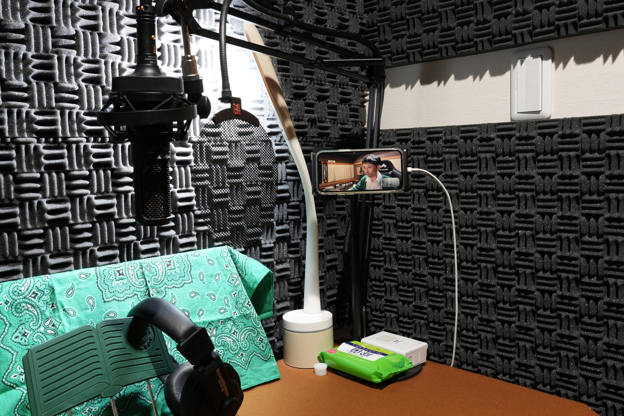なお、ブース内のスマホ(SIM無効)が通知やサウンドなどで収録を妨害しないよう、設定には最新の注意を払っております。